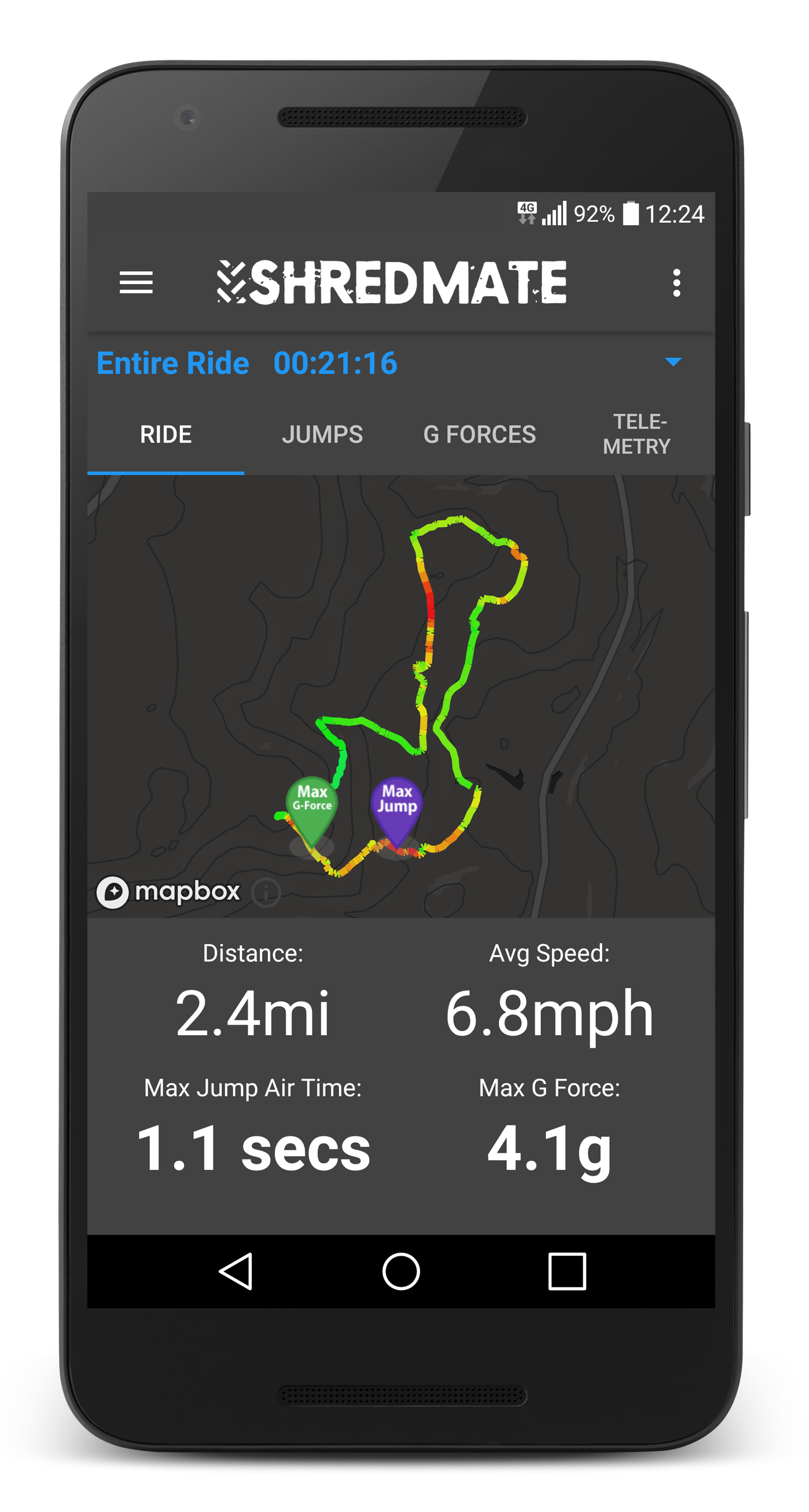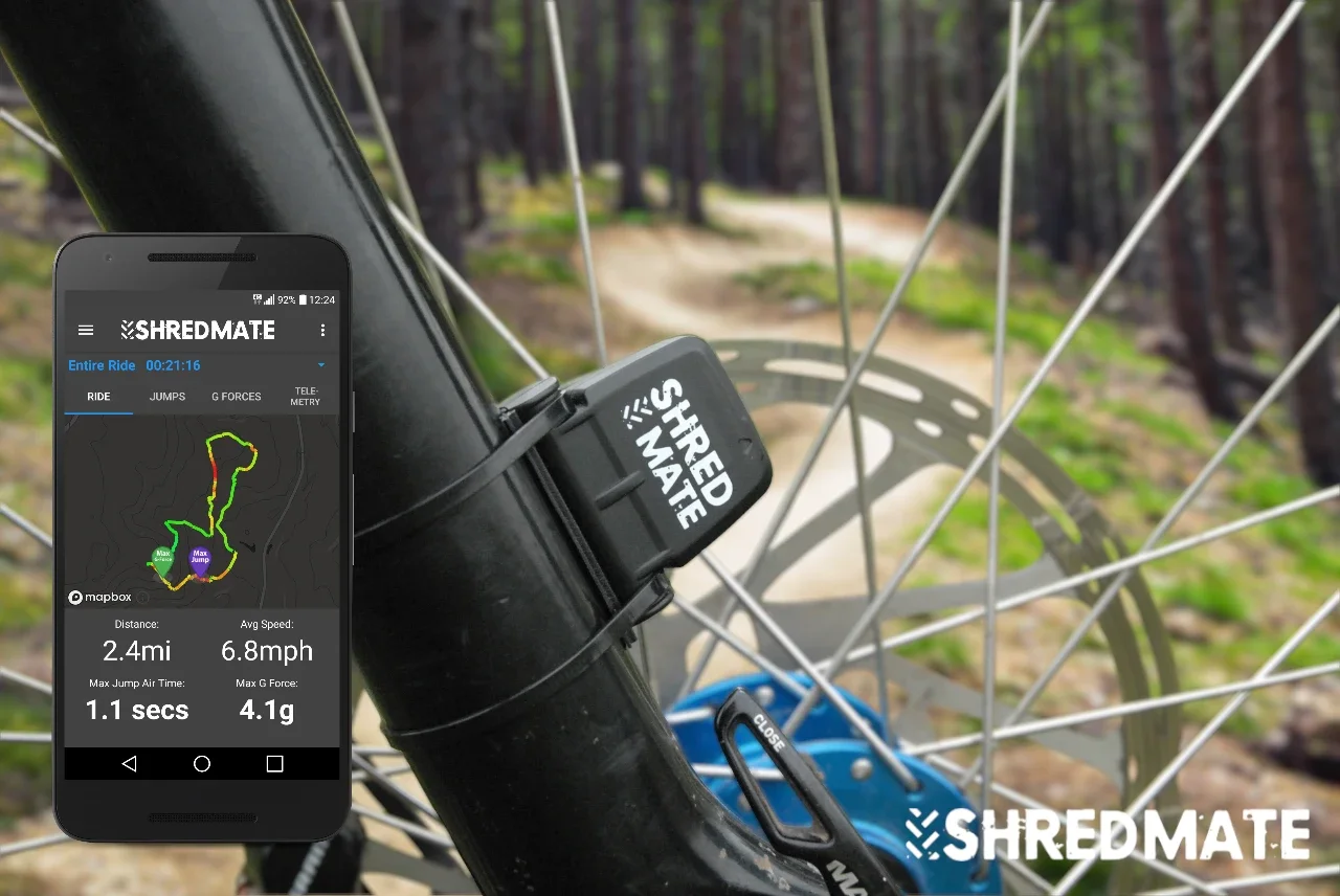 ShredMate is a fork-mounted motion sensor paired with a smartphone app that tracks mountain bike - specific moments like jumps (airtime + landing g), peak g-forces, and rough trail segments, visualised on a map after your ride.